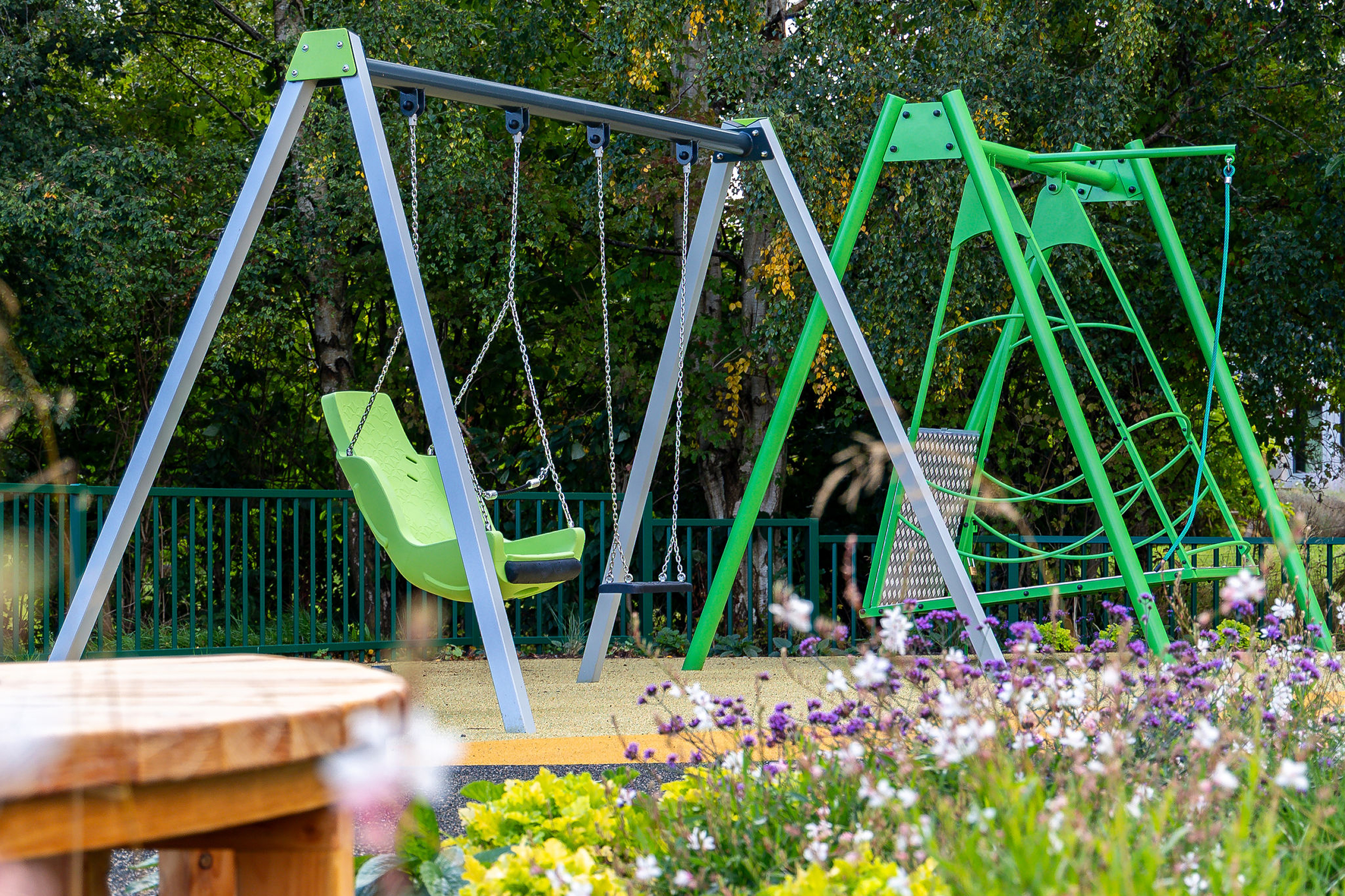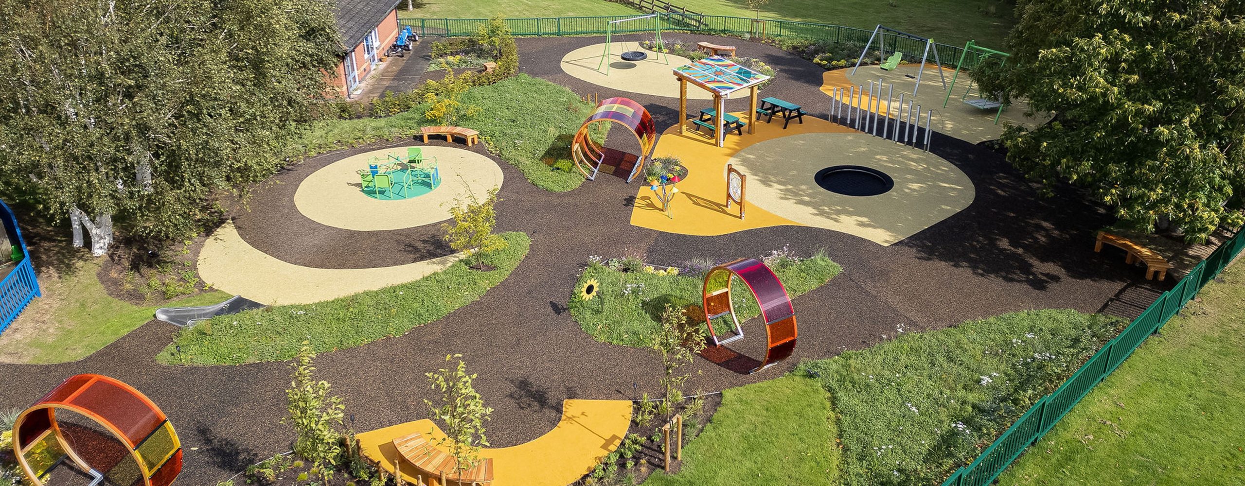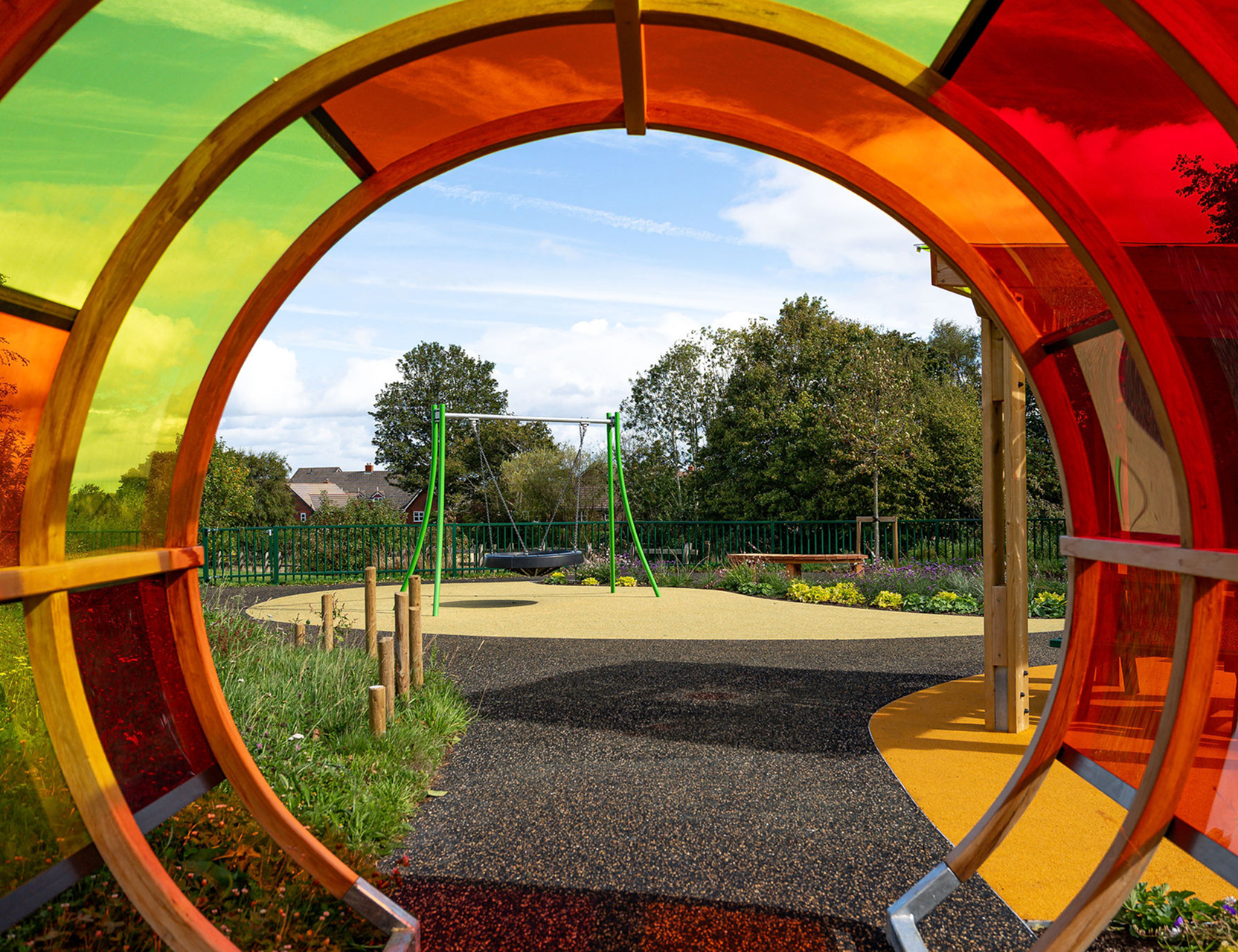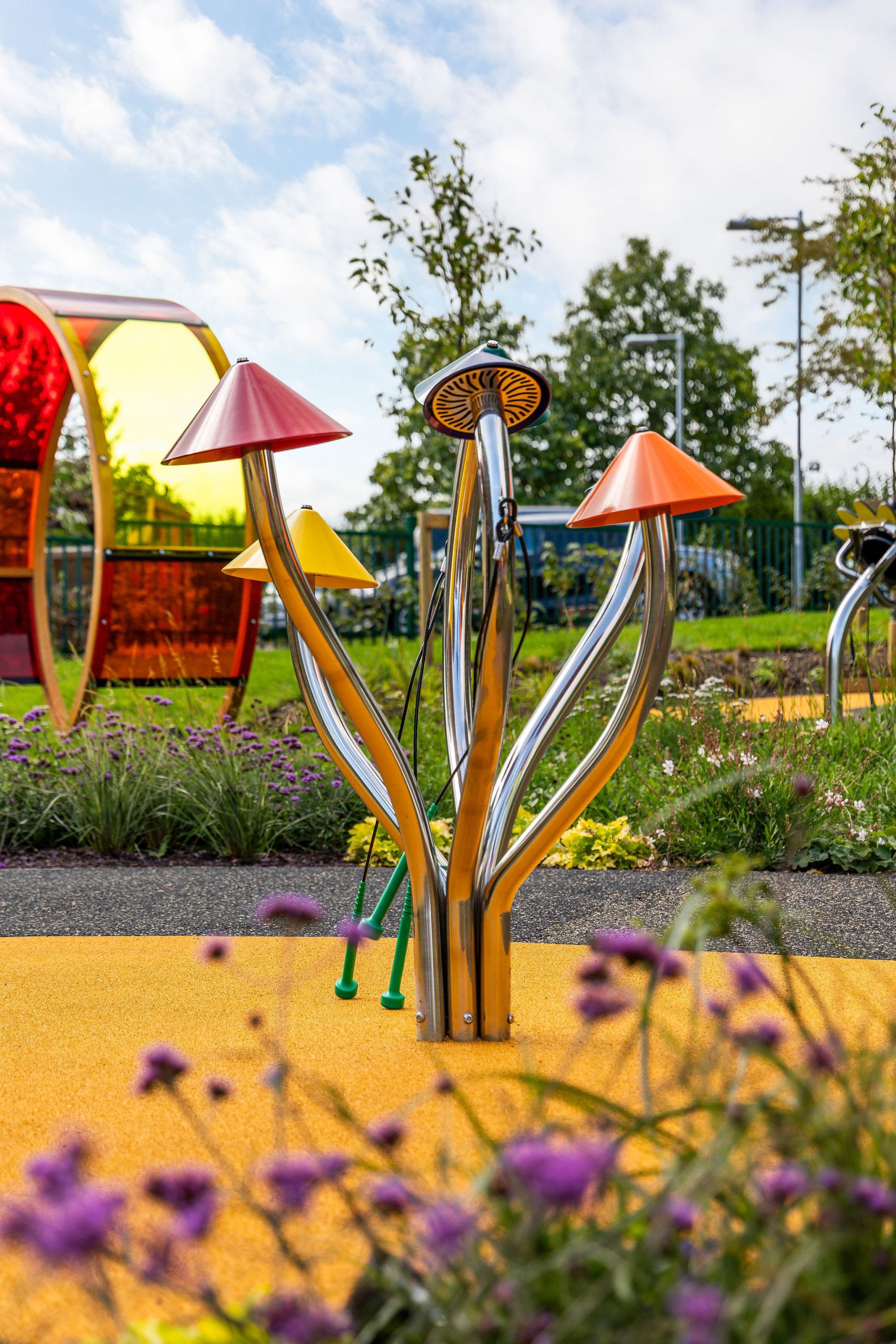 A series of inclusive play features were installed, each chosen to stimulate the senses and encourage interaction. The space includes a sensory tunnel, accessible swings, a slide, musical play posts and areas of colourful surfacing. Together, these features create a playful environment that encourages movement, sound and touch for children of all abilities.