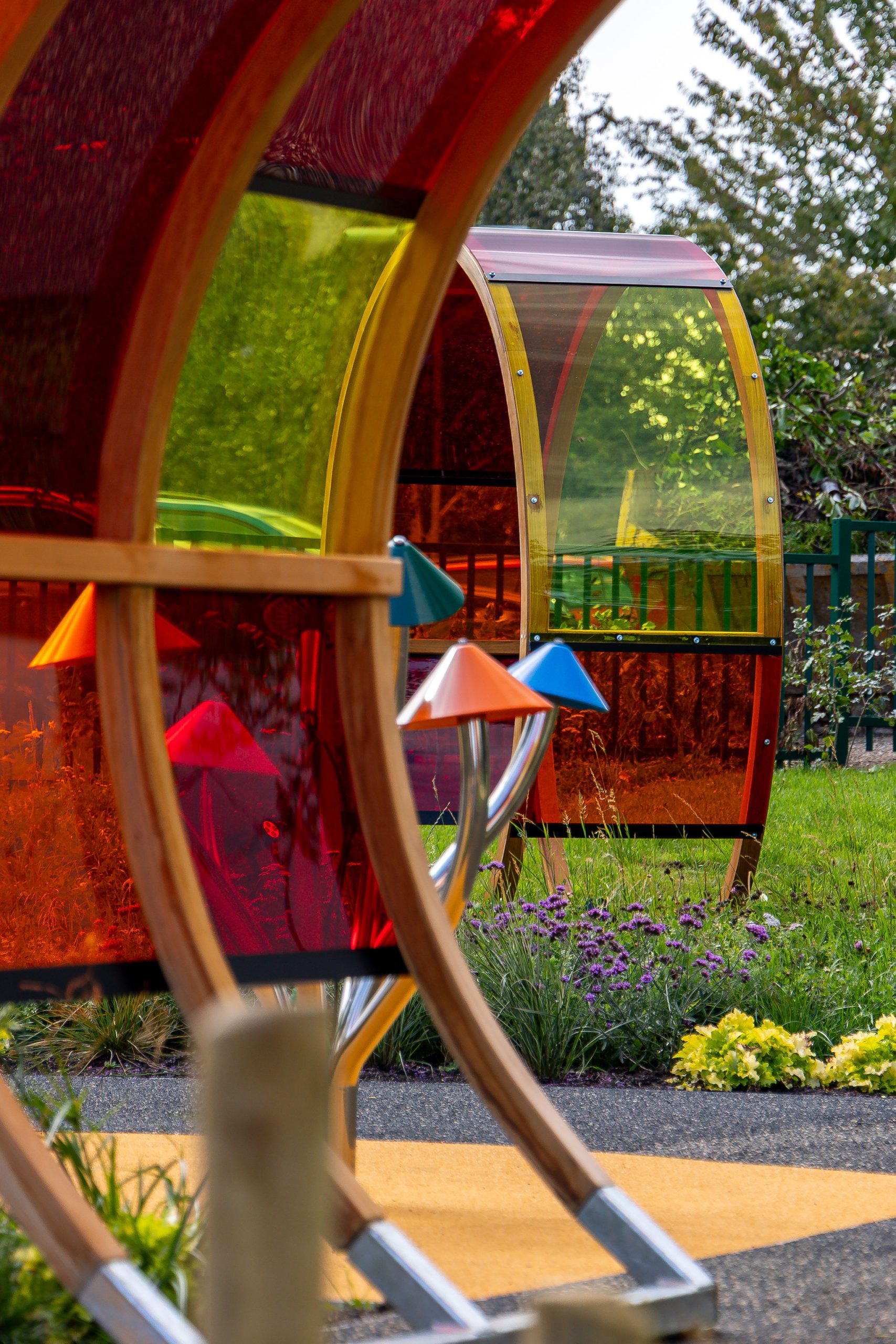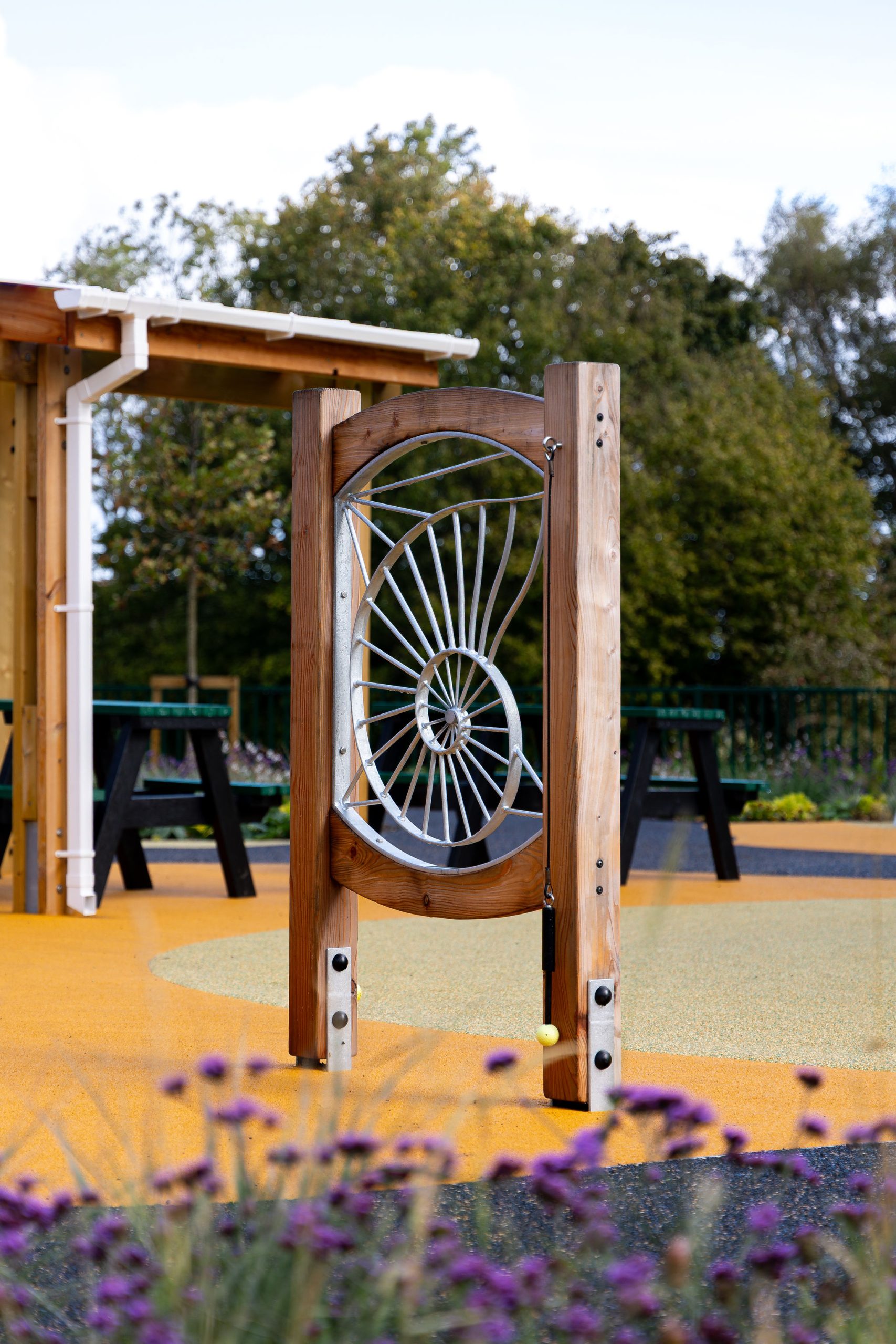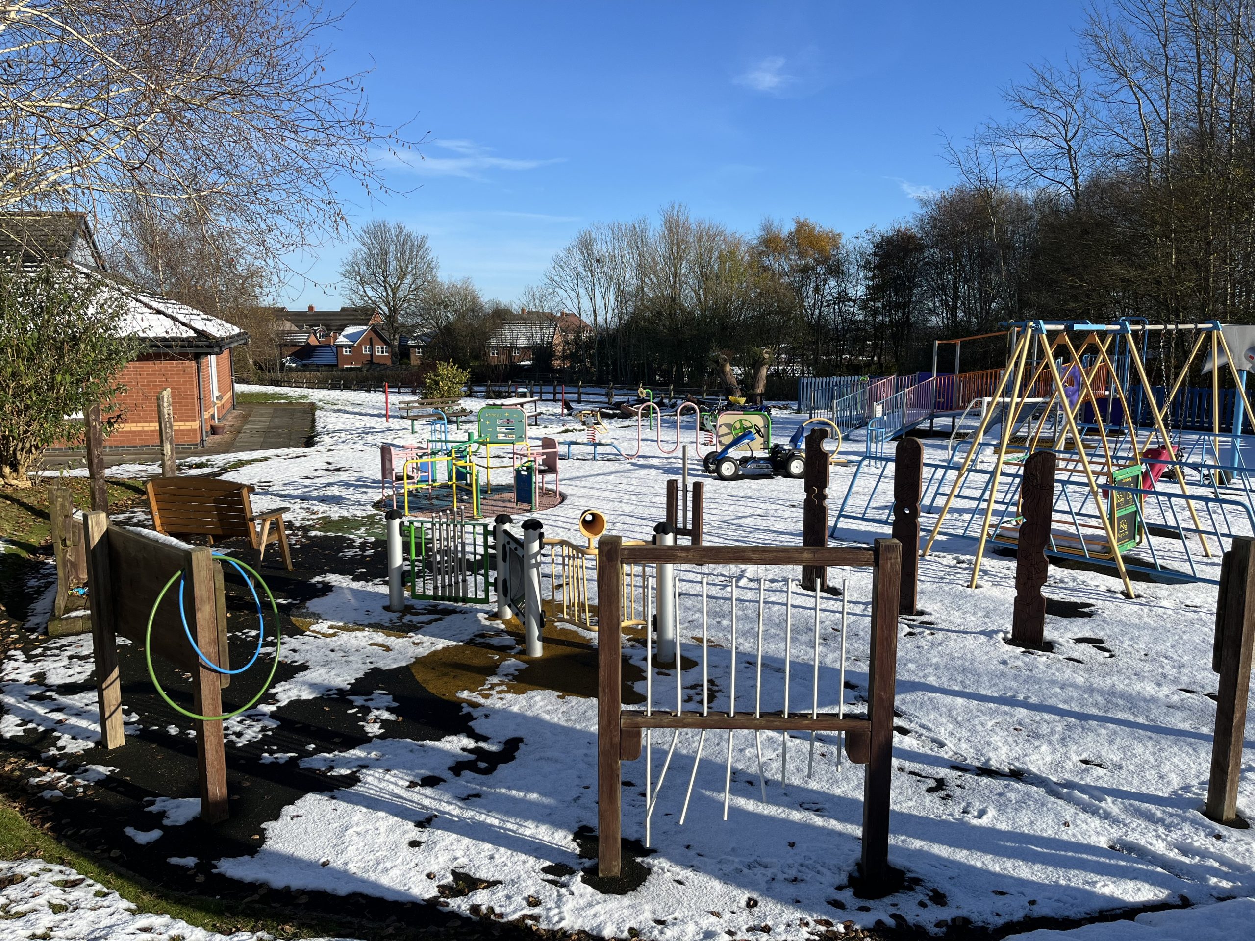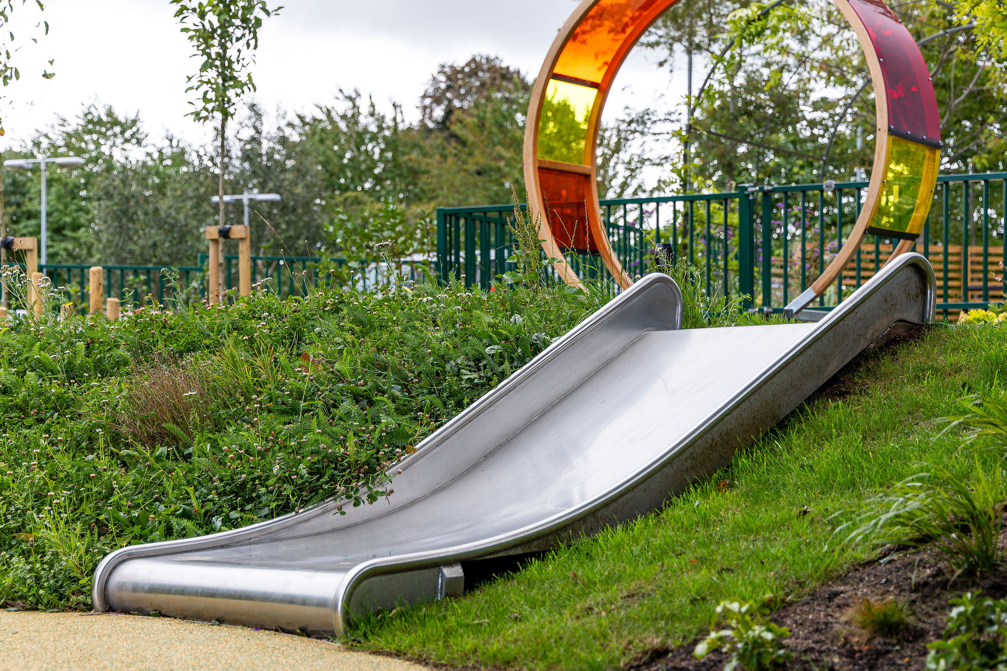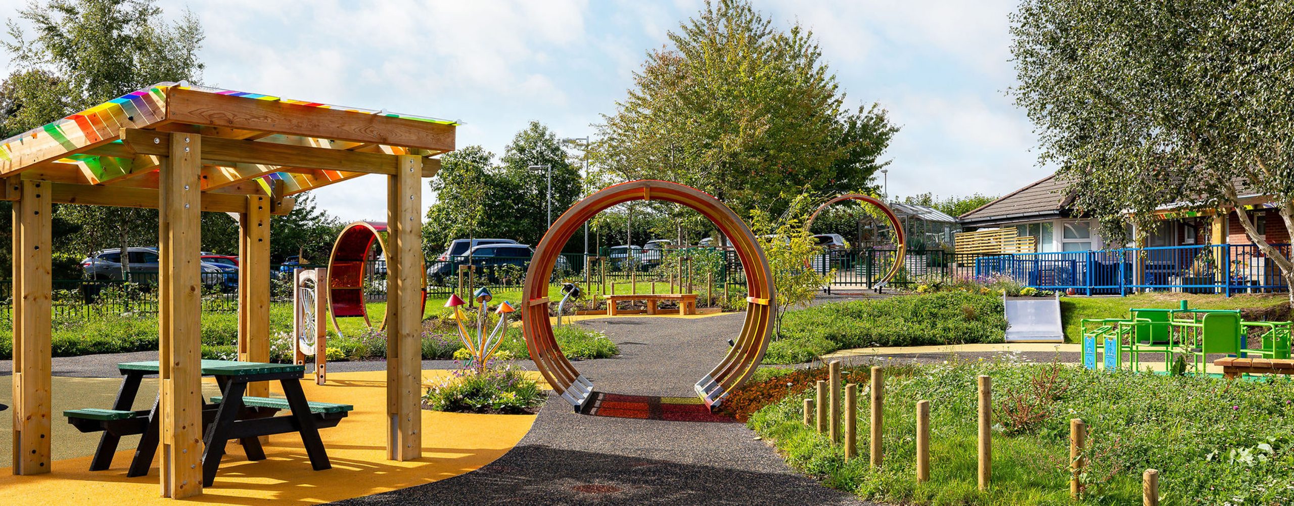 A series of inclusive play features were installed, each chosen to stimulate the senses and encourage interaction. The space includes a sensory tunnel, accessible swings, a slide, musical play posts and areas of colourful surfacing. Together, these features create a playful environment that encourages movement, sound and touch for children of all abilities.