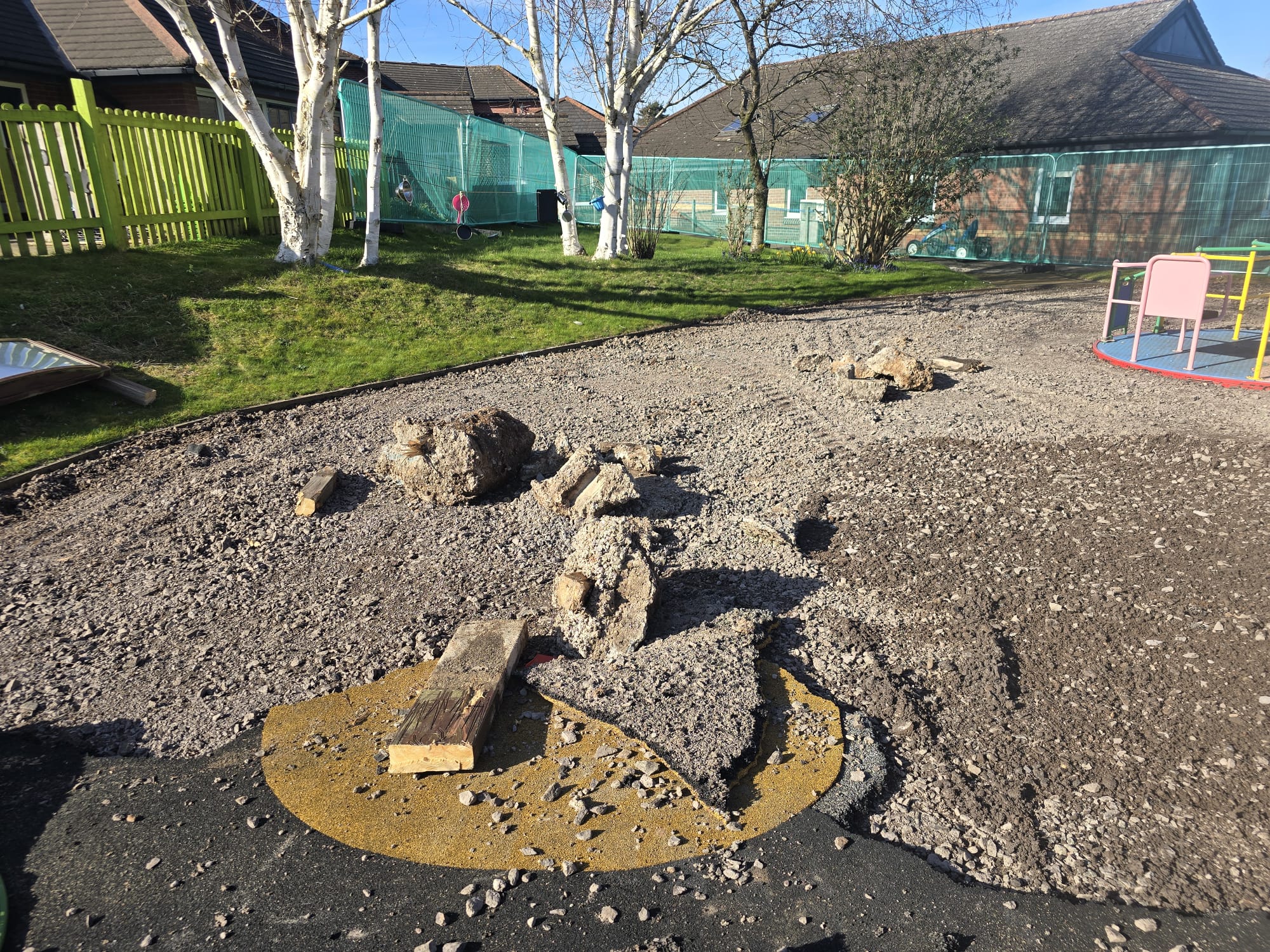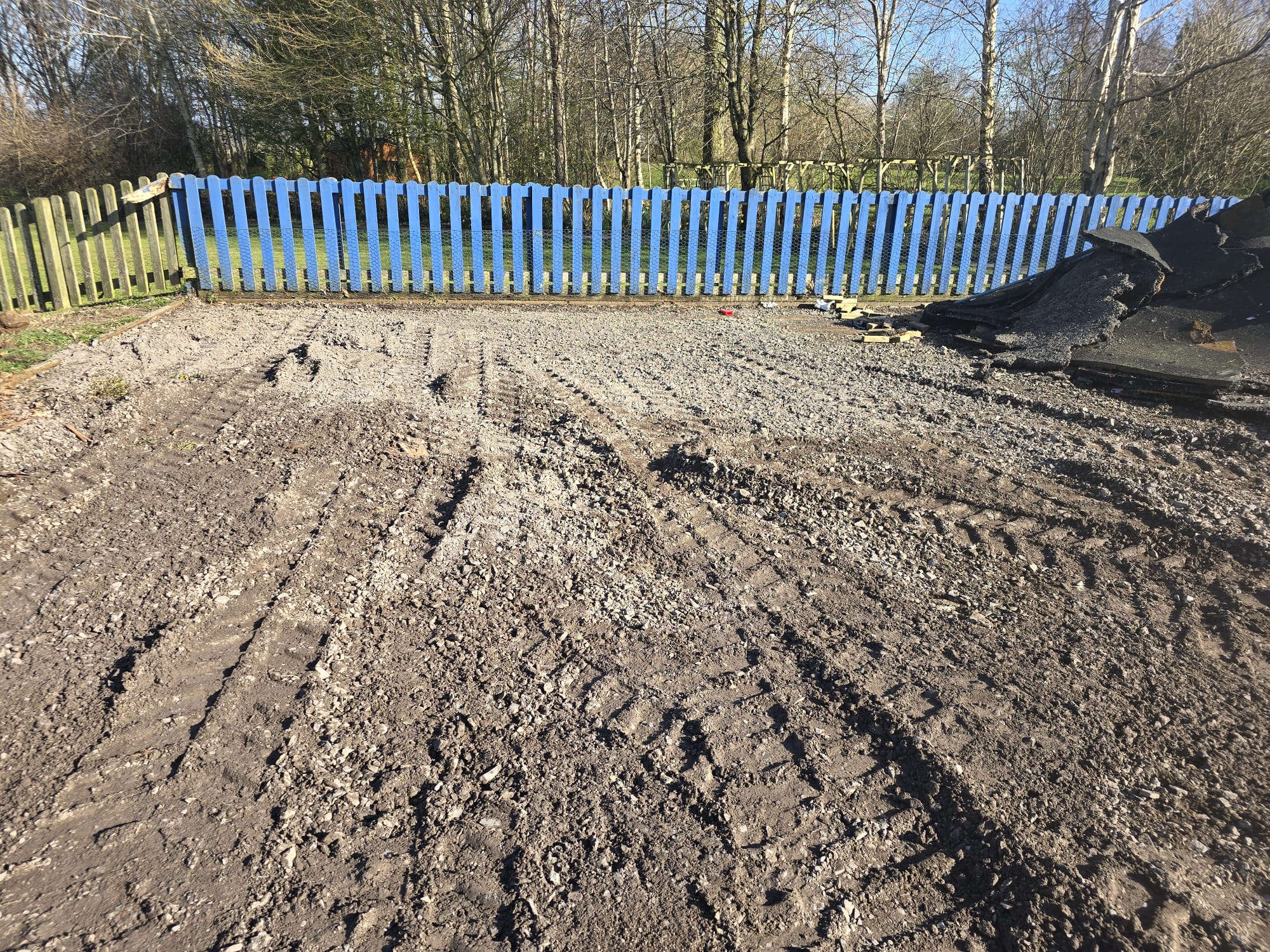 Our team began by carefully removing the existing playground equipment and preparing the site for redevelopment. The ground was shaped and re-levelled to form new, accessible levels ready for installation. Sections of colourful rubber tarmac surfacing were then laid to define key play areas and provide a safe, durable base. These works provided the foundation for a functional and welcoming outdoor space, ensuring every detail was considered.